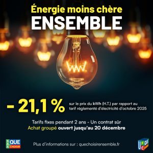 Alors que les tarifs réglementés de vente restent 20% supérieurs à ceux qui prévalaient avant la crise de l’énergie, et que l’incertitude demeure sur les évolutions des prix de l’électricité au cours des prochaines années, l’UFC‑Que Choisir Dordogne a le plaisir, à l’issue d’un appel d’offres auprès des fournisseurs nationaux, organisé par la filiale SAS Que Choisir, de vous proposer un achat groupé autour de l’offre « Énergie moins chère ensemble », à prix fixes 2 ans, avec 21,1 % d’économies (HT) sur la consommation d’électricité par rapport au tarif réglementé de novembre, soit la meilleure offre à prix fixes actuellement sur le marché. Cet achat groupé, dont l’offre est garantie aux 150 000 premiers souscripteurs, court jusqu’au 20 décembre 2025 inclus.